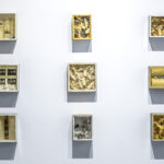 The other idea concerns the exploration of the individual’s role in the community, specifically how we communicate, interact and question our origin. This is explored in the bodies of work Sanctum Boxes (mixed media box constructions), Heart Strings (oil paintings) and Sacred Fabric (large photographs of carefully arranged (‘drawn’) cheesecloth).