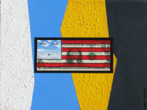 To render these images, I incorporate a variety of media such as: acrylic, pencil, pastel, watercolor, ink, and colored pencil. I also use collage in a lot of my work. Things like old photographs, cloth, buckskin, money, bingo sheets, pages from the bible in Navajo and English are found on my canvas’ and wooden pieces. This technique of collage is vital to my work because it thrusts upon the viewer the differing images and realities of the modern world and the tribal world.
