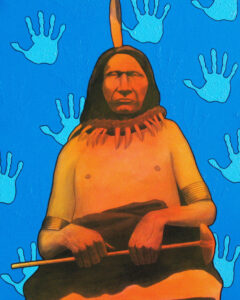 To do this I combine elements from the modern world and elements from the tribal world. This often results in whimsical images that speak of the sacred and the secular aspects of our world. It is also no coincidence that I use symbols and metaphor along with fragments of realism, surrealism, abstraction, and other -isms to suggest what I am trying to say. Some of my paintings are my own interpretations of history, fueled by personal feeling. Others have to do with my personal experiences of growing up between American culture and my Native cultures’. And yet others portray free associations that I conjure up, even imagined worlds.