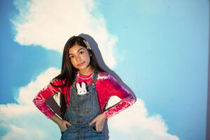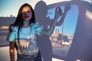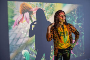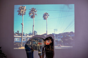 Sarah created slides from images she took whilst traveling and then projected them for a kids style series with model Calista Evangeline.